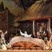 The sound of horns announces the arrival of a hunting party, amongst whom are Albrecht’s betrothed, Princess Bathilde, and her father. By chance, they are seeking rest and refreshment in the village, and Bathilde, charmed by Giselle’s innocence and beauty, gives her a gold necklace. When the hunting party retires, the peasants begin to celebrate the new vintage, but Hans has meanwhile searched Albrecht’s cottage and discovered his sword, proof of his identity.