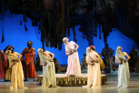 Gulnara is the jewel of the harem, and none of the other slaves brought by Lankedem pleases the Pasha. When Lankedem reappears with Medora, the Pasha is delighted. He buys her and is greeted by a scene in a garden of beauties. But mysterious pilgrims suddenly appear in the palace, and they are invited to join in evening prayer.